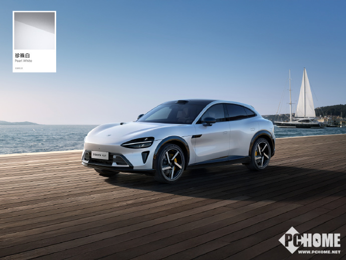YU7停于滨海木质平台,车身线条流畅,融合轿跑与 SUV 风格。车顶的黑色设计与珍珠白车身形成对比,搭配大尺寸轮毂,运动感十足。背景中的海水、帆船,更衬出珍珠白配色的优雅质感。