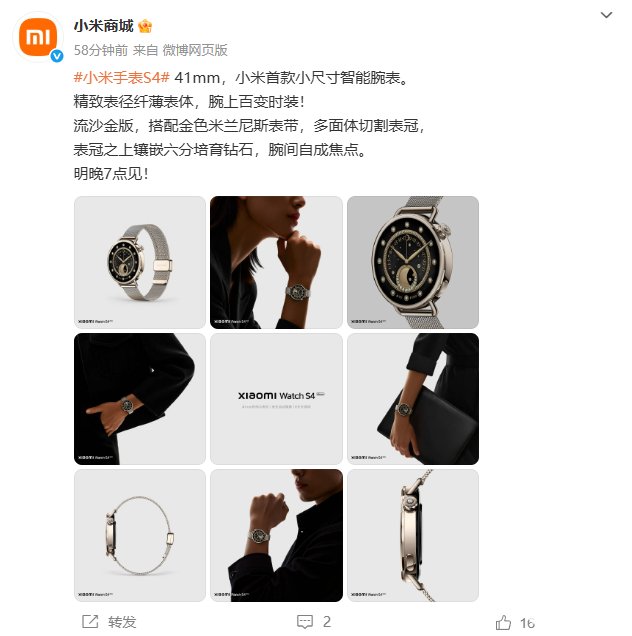 6月25日消息,小米商城官方微博发文称,小米明晚7点将发布小米首款小尺寸智能腕表——小米手表S4,表壳尺寸仅41mm。