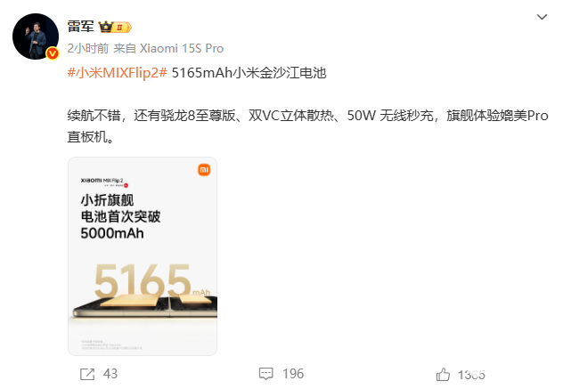 小米创办人,董事长兼CEO雷军今早发文表示,小米MIX Flip 2续航不错,还有骁龙8至尊版、双VC立体散热、50W无线秒充,旗舰体验媲美Pro直板机。