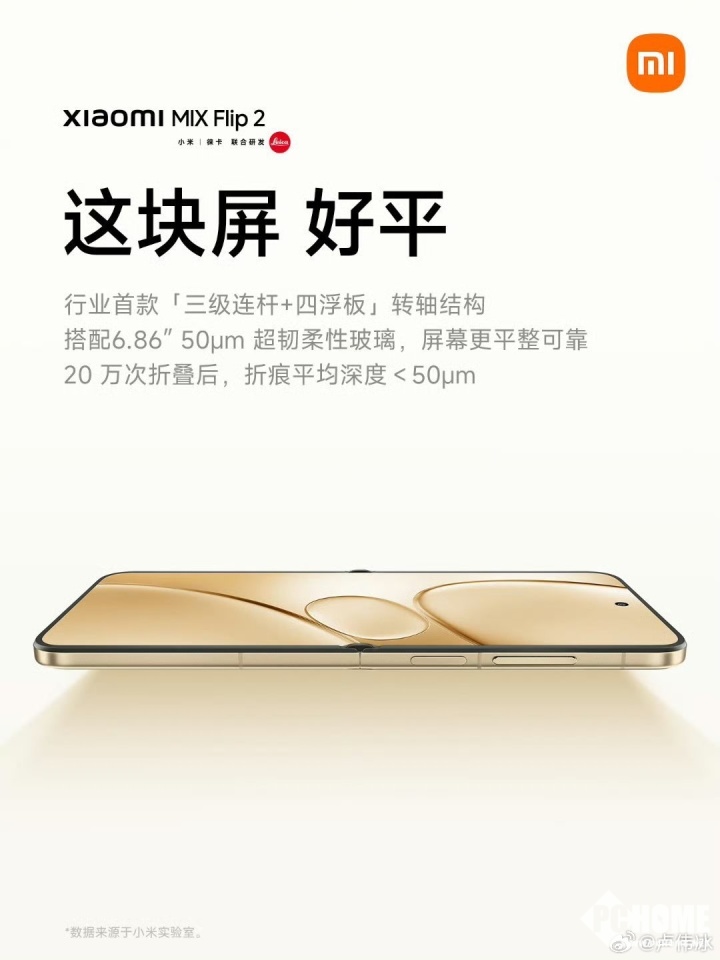 除此之外,小米MIX Flip 2搭载全新一代小米龙骨转轴,行业首发“三级连杆+四浮板”全新结构,屏幕平整度大大提升,同时采用6.86″50μm超韧柔性玻璃。20万次折叠后,折痕平均深度小于50μm,相当于A4纸厚度的一半。