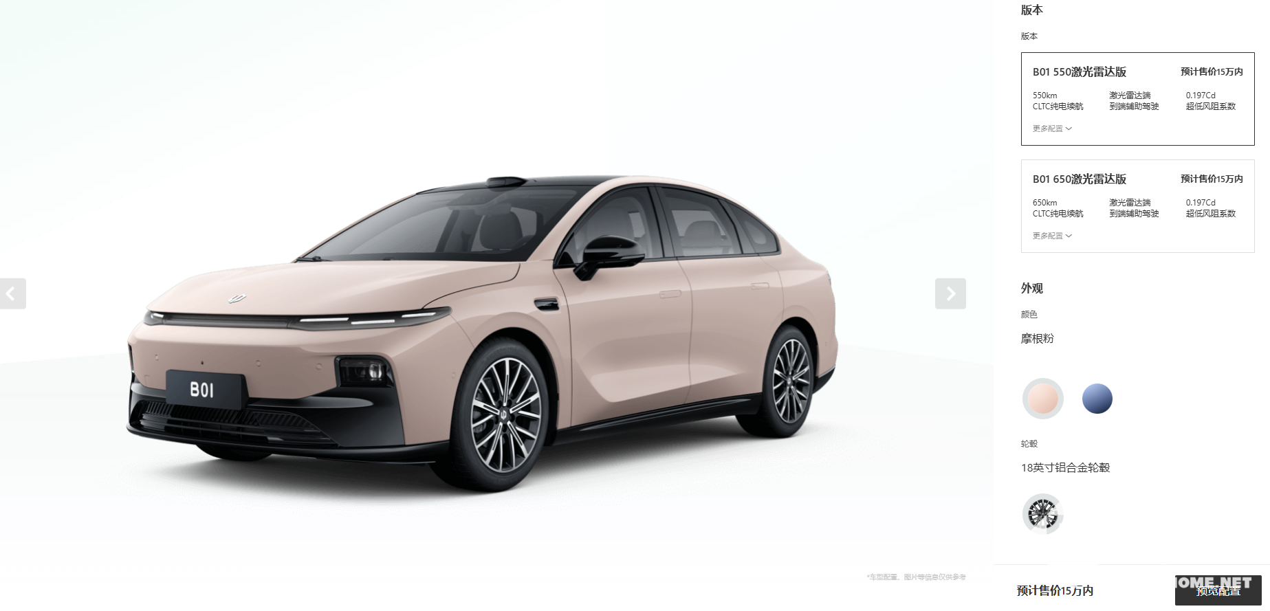 据了解,作为B平台首款轿车,B01延续了家族化设计语言,分体式头灯和溜背式车身,风阻系数低至0.21Cd28。车身尺寸为4770/1880/1490mm,轴距2735mm,可选激光雷达版本。该车配有隐藏式门把手、贯穿式尾灯,可以看到顶部有激光雷达。提供8种车色(如摩根粉、星夜蓝等)和幻月紫/纤云灰两种内饰配色。车内配备14.6英寸2.5K中控屏、8.8英寸全液晶仪表,副驾前方设有6个 “魔术拓展孔”,可安装折叠桌板等配件。