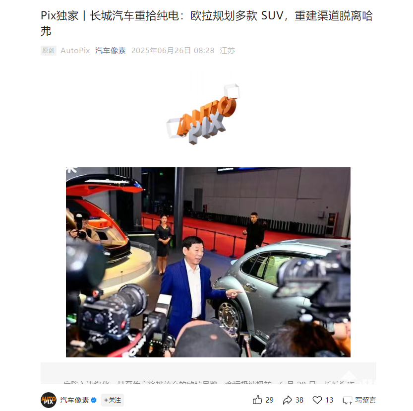 6月26日,据“汽车像素”公众号,欧拉计划重建独立渠道。为了提振经销商的投资信心,欧拉展示了四款全新的车型,其中包括数款SUV、一款轿卡形态的新车。这些都是欧拉从未尝试过的产品。如今哈弗、坦克、魏牌的主销车型偏向混动,“复活”中的欧拉是长城唯一维持纯电定位的品牌。