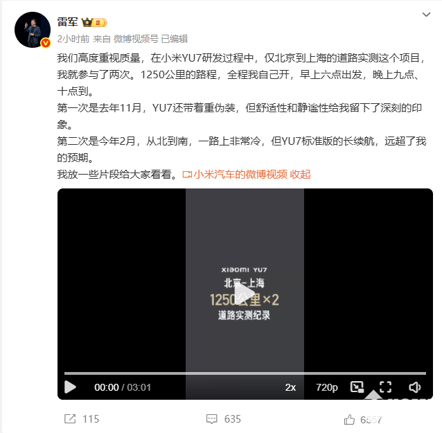 6月26日,小米创办人,董事长兼CEO雷军发文表示,在YU7的研发过程中,小米高度重视质量。从北京到上海的道路实测这个项目,雷军亲自参与了两次,1250公里的路程,全程他自己开。第一次是去年11月,YU7还带着重伪装,但舒适性和静谧性给他留下了深刻的印象。第二次是今年2月,从北到南一路上非常冷,但YU7标准版的长续航远超他的预期。并放出来路测过程的部分片段。