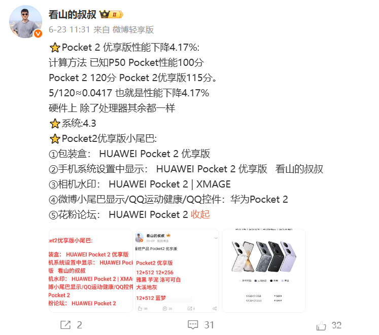 数码博主@看山的叔叔发文称,与此前的华为Pocket 2相比,Pocket 2优享版的性能有所下降。虽然新版本的整机性能提升了15%,相比P50 Pocket提升了20%,但优享版在性能方面略微低于原版。