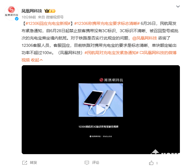据凤凰网科技报道,对于铁路是否实行此规定的问题,12306客服人员回应称:目前铁路对携带充电宝的要求是标志清晰、单块额定输出功率不超过100W,客服暂未提及涉及3C认证或召回批次管控。