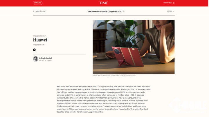 美国《时代周刊》公布2025年“全球100大最具影响力企业”榜单,华为继2023年后再度上榜。这不仅体现了全球对华为综合实力的高度认可,也再次凸显其在全球科技变革中的核心地位。