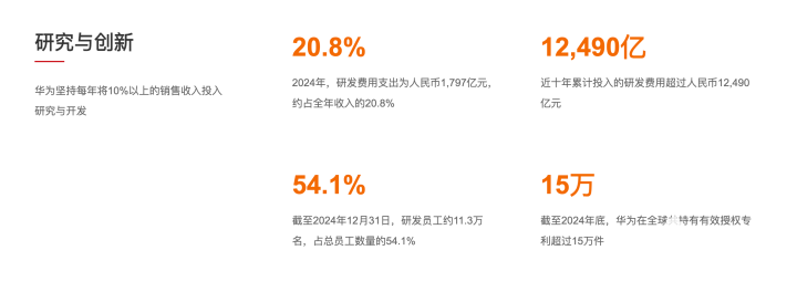 持续高强度的研发投入是华为长期保持技术领先的底气。数据显示,2024年华为研发投入高达1797亿元人民币,占全年营收的20.8%。过去十年,公司累计研发支出已突破1.24万亿元,远超行业平均水平,堪称全球技术企业中的“长跑者”。