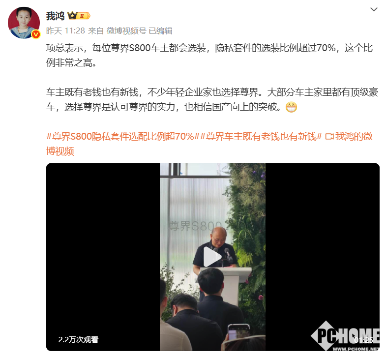 微博原创视频博主@我鸿发文称,项兴初在交付现场表示,尊界上市以来,仅用19天累计订单突破5000台。每位尊界S800车主都会进行选装,隐私套件的选装比例超70%。