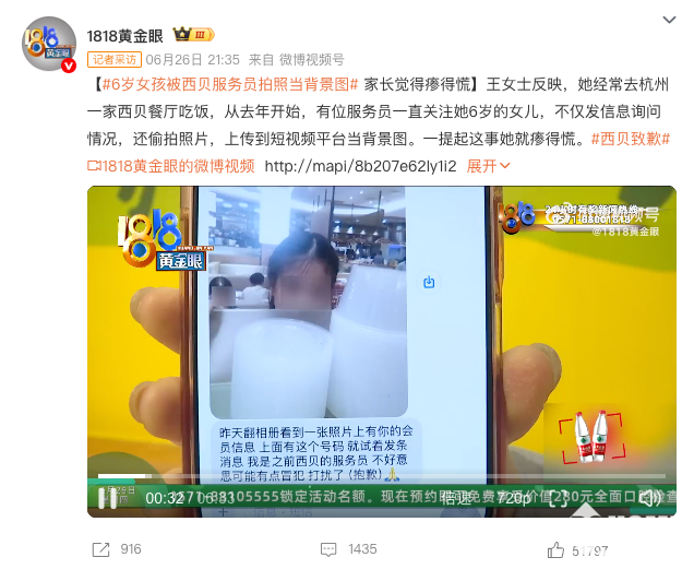 近日,一起涉及用户隐私的事件引发舆论关注。6月27日,1818黄金眼报道称,杭州一位家长反映其6岁女儿在就餐过程中被西贝餐厅男服务员偷拍,并被用作个人抖音账号背景图。事件曝光后引发公众对西贝隐私保护管理的强烈质疑。