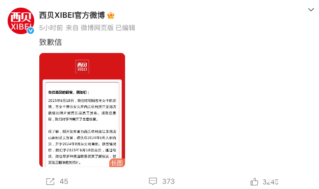 对此,西贝餐饮通过官方微博发布声明回应。声明称,经内部核查,涉事员工贺某为已离职员工,其个人行为严重违反公司规定。在与当事人沟通后,对方已删除相关图片,西贝就此次事件向顾客致以诚挚歉意。