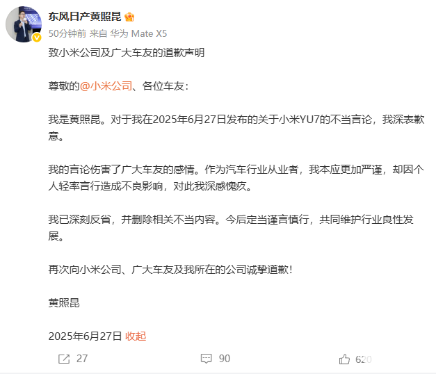 6月27日,东风日产动力和三电负责人黄照昆就今日上午针对小米YU7热销,发表的不当言论进行了致歉。