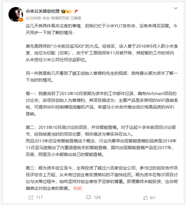 6月27日,小米公关部总经理王化对此前猫王音响创始人曾德钧吐槽雷军一事进行了回应。并表示顺为资本创立至今,从未有过创业者反馈类似的不愉快经历,在每次项目讨论与决策过程中,始终坚持对创业者给予足够的尊重。即便最终未能投资,也会明确表达对创业者的敬意。