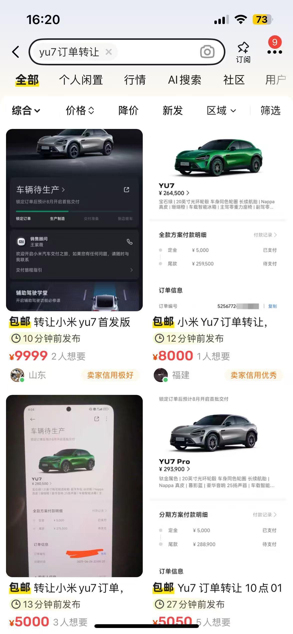 小米YU7在昨晚上市过后,3分钟大定突破20万台、1小时大定突破28.9万台。但同时Pchome也注意到目前有大量“黄牛”在二手平台挂出YU7订单加价倒卖。转让价格5000—10000元不等。
