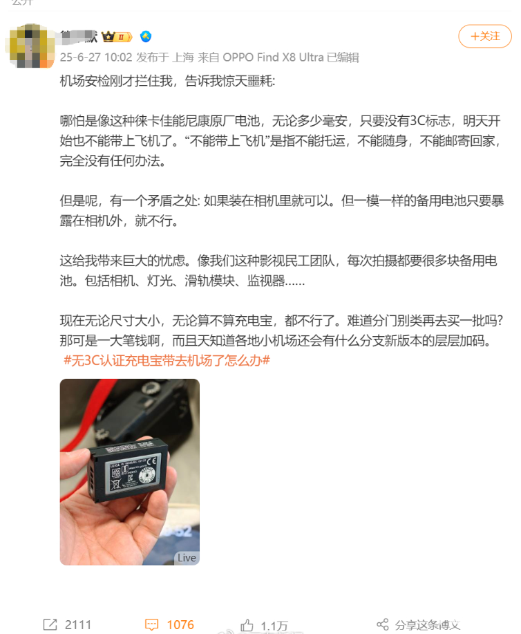 今日,有网友发帖称,在机场过安检时,数码相机的电池没有3C标识也不能过检。随后,有媒体从上海浦东机场、虹桥机场、北京首都机场、大兴机场、广州白云机场等多个国内机场了解到,目前民航局通知只针对充电宝,相机锂电池依然沿用之前的检查标准。