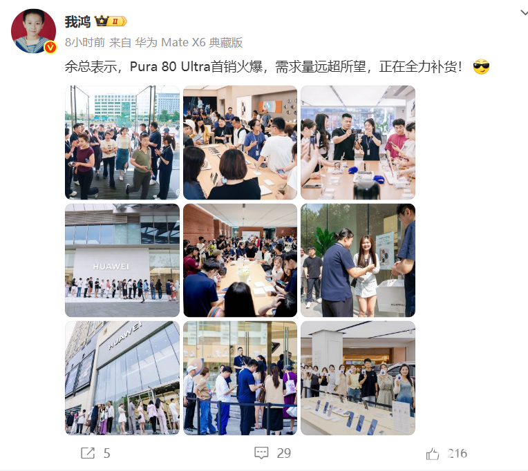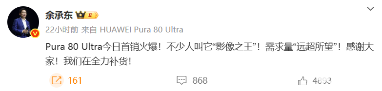 面对如此火爆的销售场面,华为常务董事、终端BG董事长余承东昨晚通过个人微博表达了感谢:“Pura 80 Ultra首销盛况空前,被誉为‘影像之王’,需求量远远超出了我们的预期。衷心感谢大家的支持!目前,我们正加班加点,全力组织补货。”