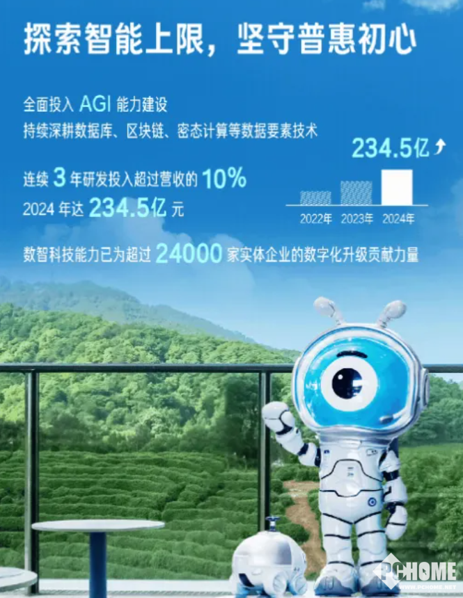 2024年蚂蚁集团全面投入AGI能力建设,持续深耕数据库、区块链、密态计算等数据要素技术。2024年科研投入达到234.5亿元,连续三年研发投入超过营收的10%,创历史新高,且数智科技能力已为超过24000家实体企业的数字化升级贡献力量。