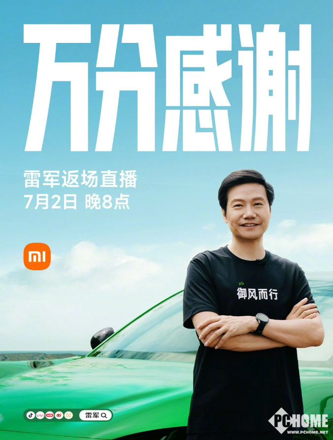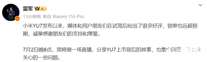 6月30日消息,小米创办人,董事长兼CEO雷军发文称,小米YU7发布以来,媒体和用户朋友们在试驾后给出了很多好评,锁单也远超预期,将于7月2日晚8点做一场直播,集中回答大家关心的一些问题。