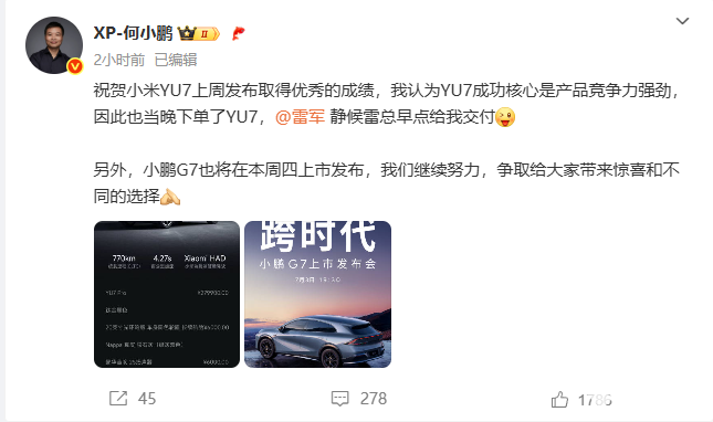 6月30日,小鹏汽车董事长何小鹏发文称,自己也下单了小米YU7,并表示:“祝贺小米YU7上周发布取得优秀的成绩,我认为YU7成功核心是产品竞争力强劲,因此也当晚下单了YU7,静候雷总早点给我交付”。