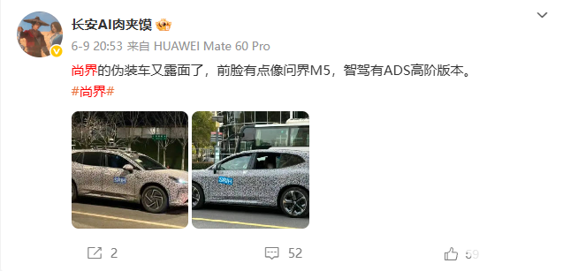 此前,博主 长安AI肉夹馍 曝光了尚界汽车的伪装车,该博主称其智驾有“ADS高阶版本”,并表示其前脸“有点像问界M5”。从伪装谍照看,尚界首车尺寸似乎要比问界M5还有大一些,目测达到中型甚至是中大型SUV标准,推测车长在4.8米-4.9米之间,轴距在2.9米左右。由于覆盖有厚厚的伪装,很多信息依旧被蒙在鼓里。