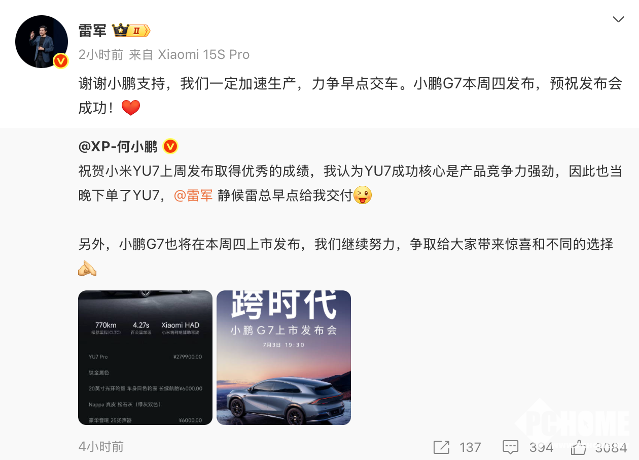 对此,小米创办人,董事长兼CEO雷军转发何小鹏的微博表示,“谢谢小鹏支持,我们一定加速生产,力争早点交车。小鹏G7本周四发布,预祝发布会成功!”