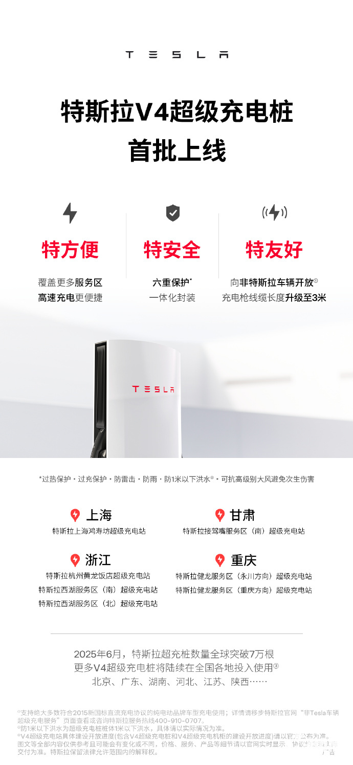 6月30日消息,特斯拉官宣,特斯拉V4超级充电桩首批上线,覆盖更多服务区,防雨防水等六重保护,同步向非特斯拉车辆开放,其他品牌车辆也能充。同时提到特斯拉超级充电桩全球已突破7万根,充电网络布局100%覆盖中国大陆省会城市及直辖市,更多V4超级充电桩将陆续在全国各地投入使用。