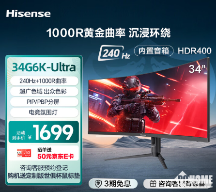 6月30日消息,海信在京东上架了一款型号为34G6K-Ultra的34英寸显示器,定价为1699元,晒单返50元E卡。