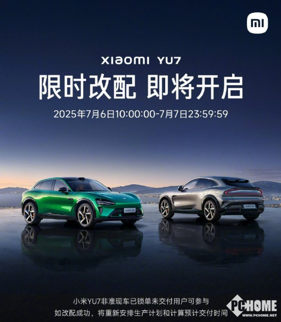 2025年7月1日消息,小米创办人,董事长兼CEO雷军转发小米汽车消息,小米YU7将开启限时改配,7月6日上午10:00到7月7日晚上24点,锁单用户(非准现车)都可参与改配。但值得注意的是,一旦进行成功改配,定单将重新排队生产,小米汽车将重新计算交付时间。
