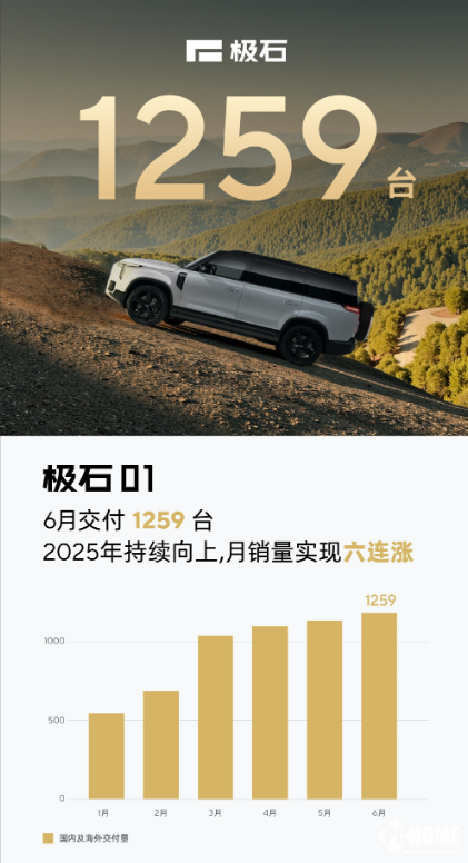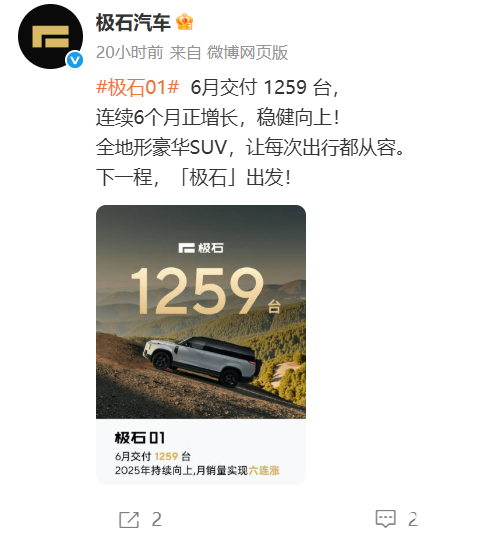 7月1日消息,极石汽车官方微博发文称,2025年6月交付1259台,2025年持续向上,连续6个月正增长。