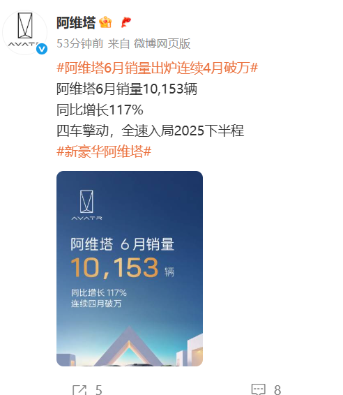 7月1日消息,阿维塔官方微博发文称,阿维塔6月销量已出炉,销量达10153辆,同比增长117%,连续四个月销售破万。