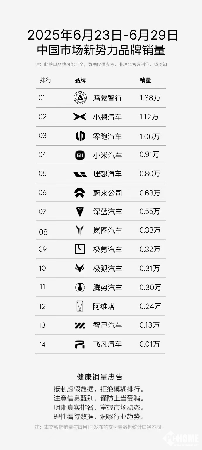 2025年6月23日-6月29日中国市场新势力品牌销量数据揭晓,鸿蒙智行以1.38万辆的周销量,登顶新势力车企周销榜榜首。