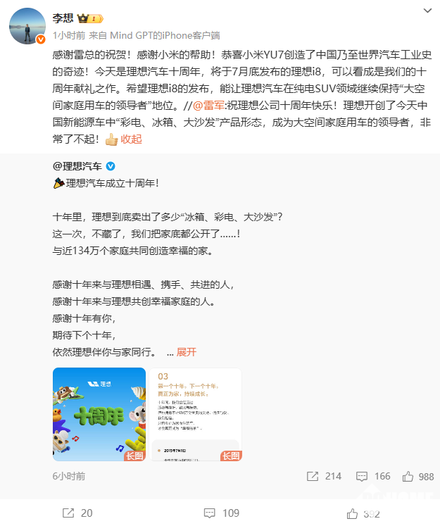 7月1日,理想汽车今日发文庆祝,理想汽车成立十周年。小米创办人,董事长兼CEO雷军转发该微博并祝贺,理想汽车CEO李想回应道,“感谢雷总的祝贺!感谢小米的帮助!恭喜小米YU7创造了中国乃至世界汽车工业史的奇迹!”