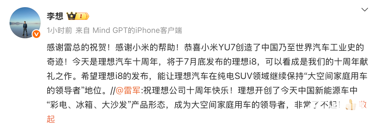 对此,理想汽车CEO李想表示,“感谢雷总的祝贺!感谢小米的帮助!恭喜小米YU7创造了中国乃至世界汽车工业史的奇迹”。此外,李想还透露,理想i8将于今年7月底正式发布,“可以看成是我们的十周年献礼之作。”
