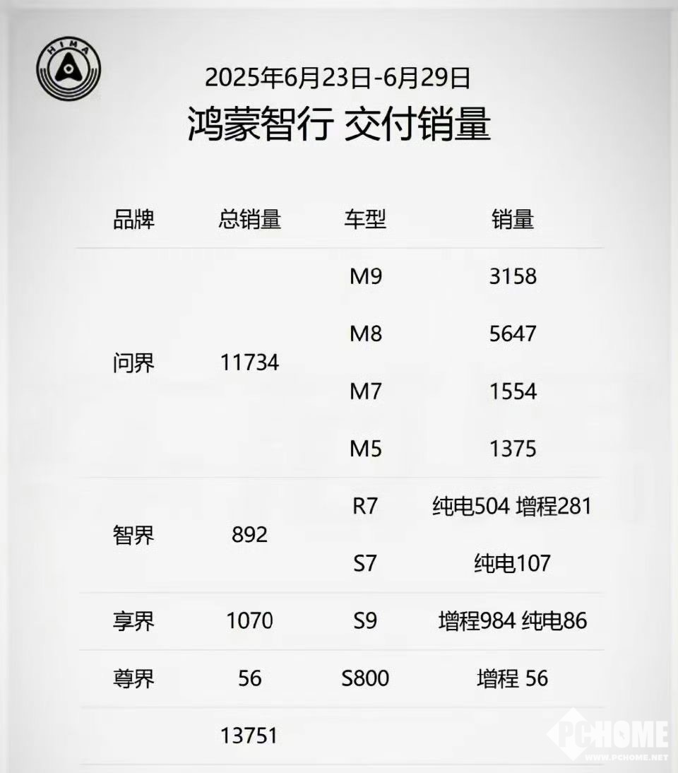 值得注意的是,网路上还出现了2025年6月23日-29日鸿蒙智行的交付数据,问界以11734辆居首,其中M8车型贡献5647辆。智界、享界、尊界也都开始起量,总交付达13751辆,展现极强的市场影响力。