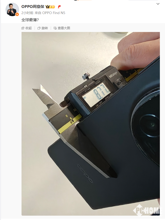 7月2日,OPPO Find系列产品负责人周意保在社交媒体发文,实测了OPPO Find N5厚度是8.77毫米,为全球最薄。