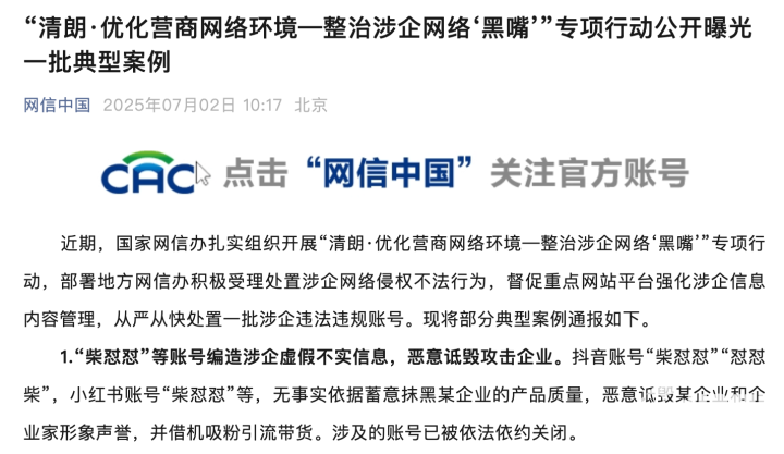 2025年7月2日,“网信中国”发文称,近期,网信办扎实组织开展“清朗·优化营商网络环境—整治涉企网络‘黑嘴’”专项行动,部署地方网信办积极受理处置涉企网络侵权不法行为,督促重点网站平台强化涉企信息内容管理,从严从快处置一批涉企违法违规账号。
