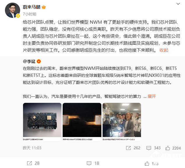 据PChome此前报道,6月30日,蔚来技术规划首席专家、助理副总裁胡成臣在社交平台发文宣布离职。紧接着,有网友发文表示“其此前主要成就是落地了蔚来的自动驾驶芯片项目”。对此上海蔚来汽车有限公司品牌与传播助理副总裁马麟回应,“胡成臣在公司时主要负责协同各研发部门研究并制定公司长期技术路线图及实施规划,未参与芯片研发等相关工作”。