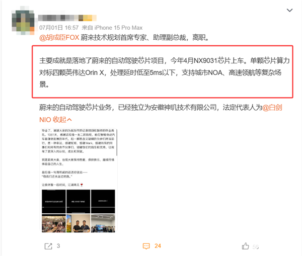 6月30日,胡成臣在社交平台发文宣布离职。紧接着,有网友发文表示“其此前主要成就是落地了蔚来的自动驾驶芯片项目”。对此蔚来高管马麟回应,“胡成臣在公司时主未参与芯片研发等相关工作”。