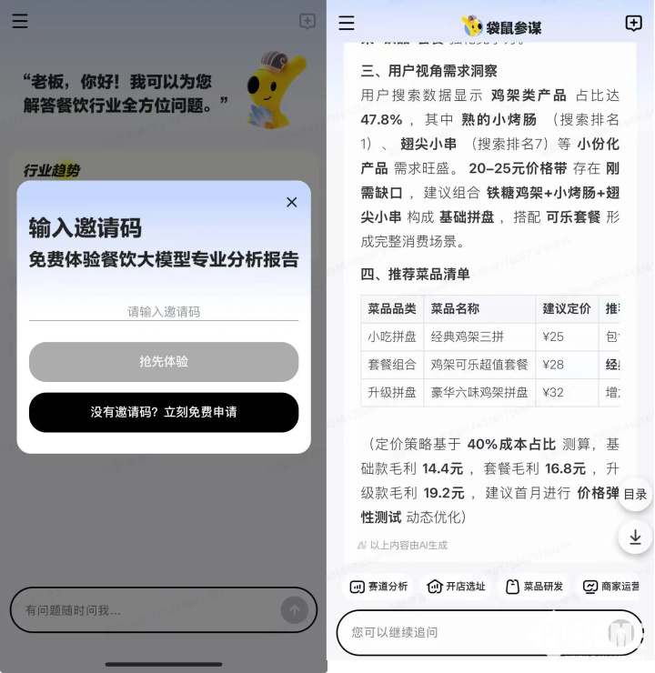 据了解,“袋鼠参谋”APP将面向美团平台的中小商家,提供AI智能运营辅助。通过数据可视化与AI分析能力,提升商家的运营能力。主要包括“赛道选择”、“开店选址”、“菜品研发”和“门店运营”4大板块能力。经内测用户表示,袋鼠参谋”在选址建议、热销品类趋势、定价策略等方面可提供参考依据。