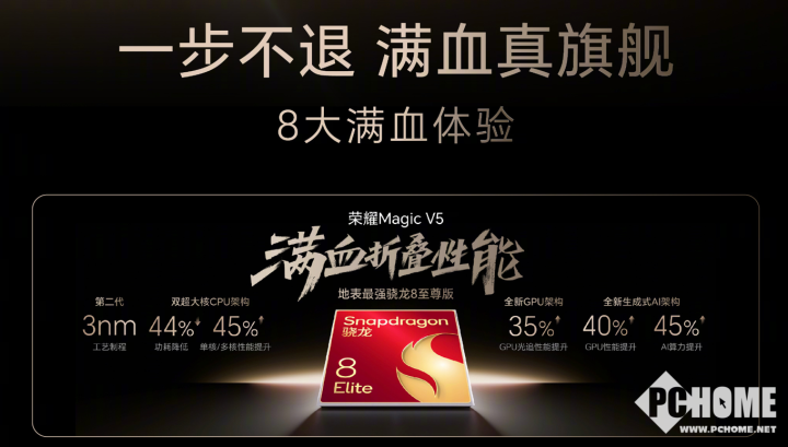性能方面,荣耀Magic V5搭载骁龙8至尊版,基于台积电3nm工艺制程打造,采用双超大核CPU架构,单核和多核性能提升45%,功耗降低33%;GPU光追性能提升35%,GPU性能提升40%,AI算力提升45%。
