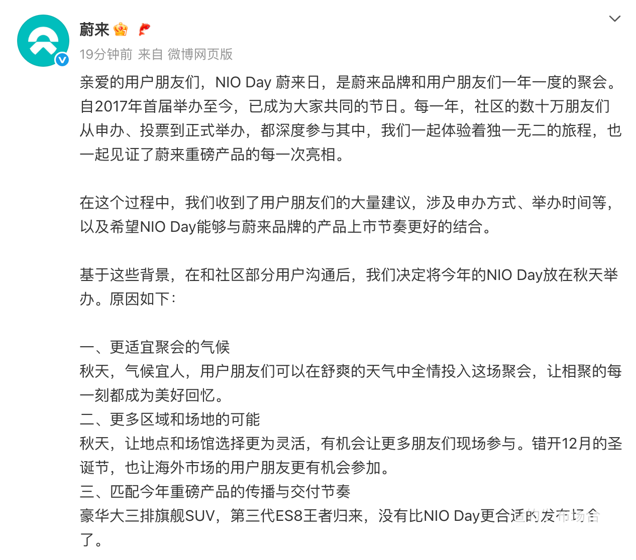 调整原因主要有三点:气候更适宜聚会,有更多区域和场地选择,能匹配今年重磅产品的传播与交付节奏。NIO Day 2025具体日期后续公布,因筹备周期紧等因素,本届暂停城市申办机制,将由筹委会确定举办城市。
