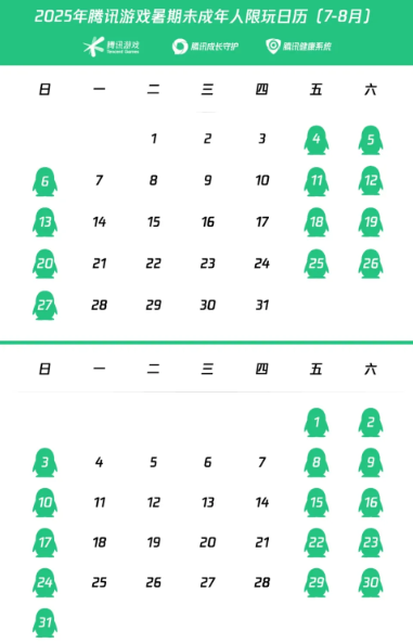 腾讯首先公布了“2025年腾讯游戏暑期未成年人限玩日历”,便于家长可以引导孩子合理安排游戏时间,适度游戏。