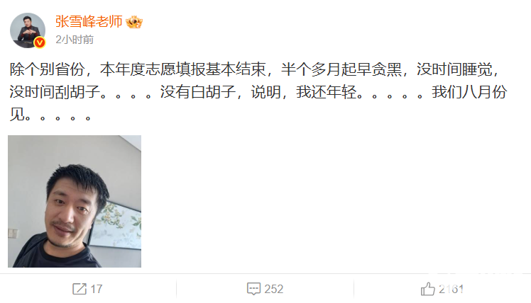 7月3日,张雪峰在社交媒体上发布了一条自己的动态并配有图文称自己“半个月没时间睡觉”,高强度处理全国志愿填报咨询。