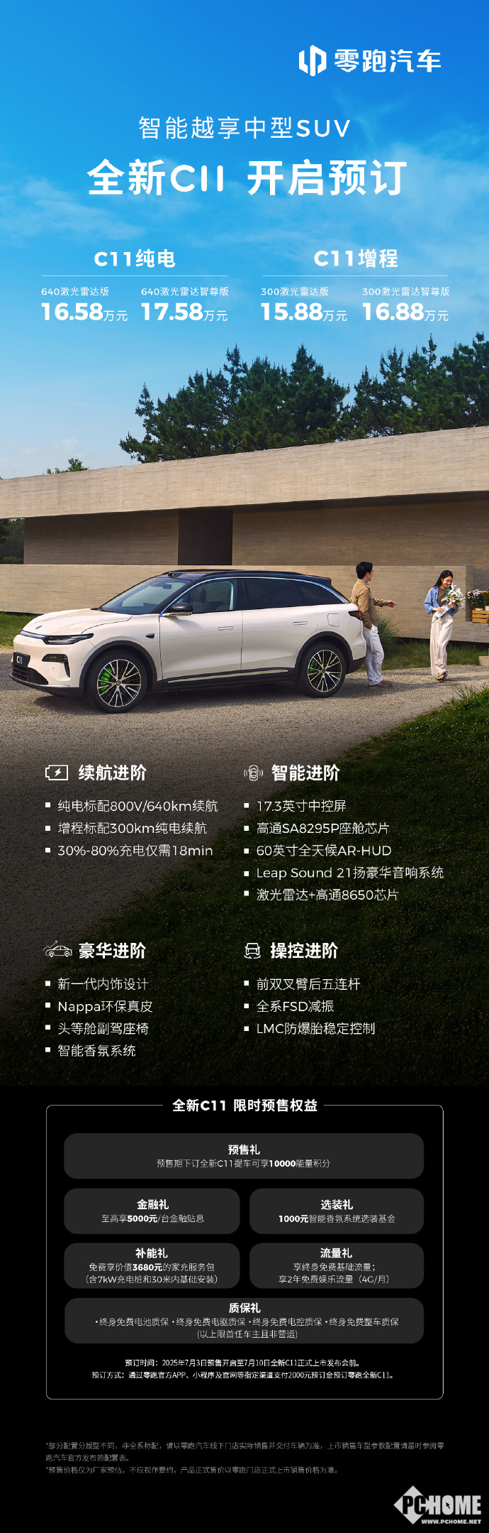 7月3日,零跑全新C11预售正式开启,推出纯电、增程两款车型。预售价15.88万起。