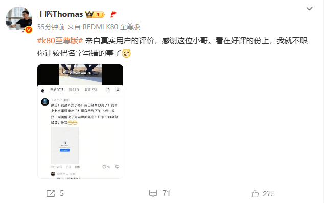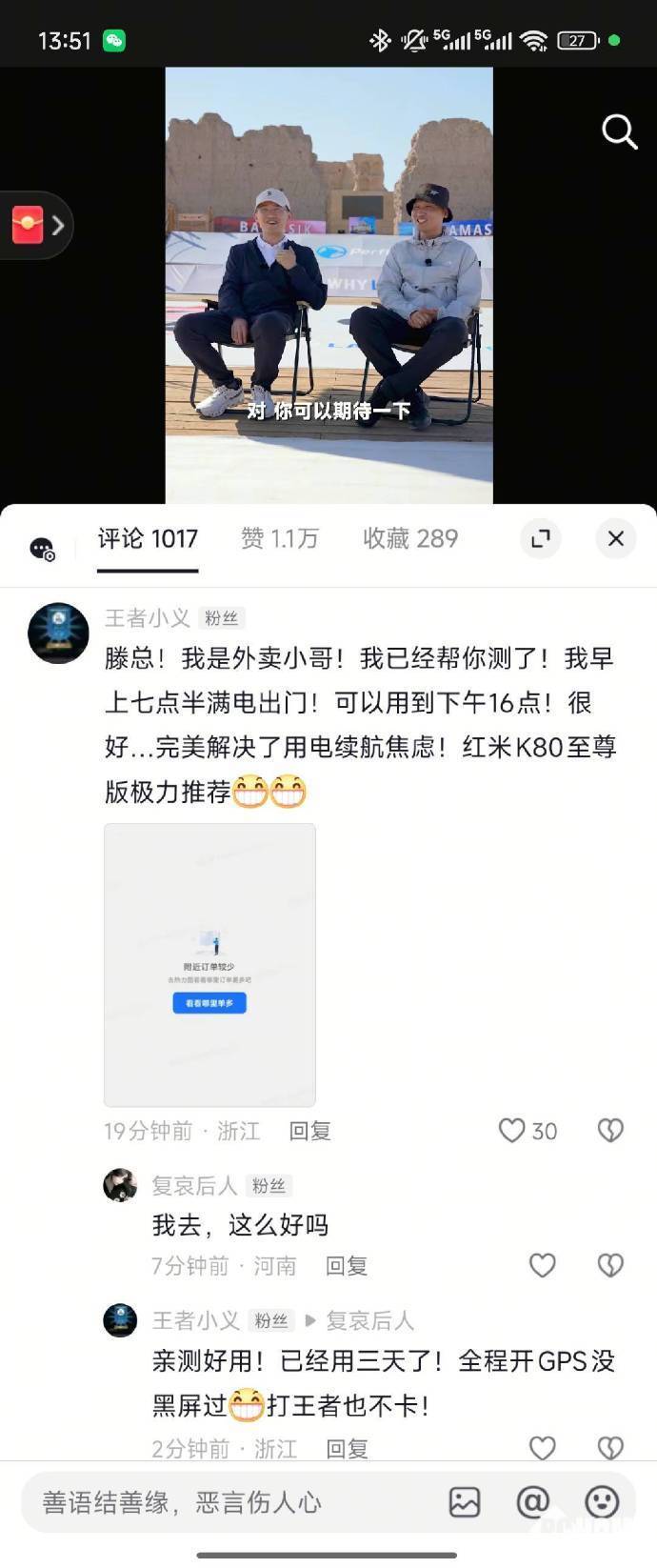 7月3日,小米中国区市场部总经理、REDMI品牌总经理王腾在社交媒体上转发了一位外卖小哥对于REDMI K80至尊版使用后的真实评价,他称,从早上七点半出门一直用到下午四点,并且全程开GPS且不黑屏。
