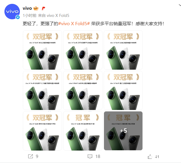 7月3日,vivo官方发布了vivo X Fold5首销战报,该机斩获多平台销量冠军。
