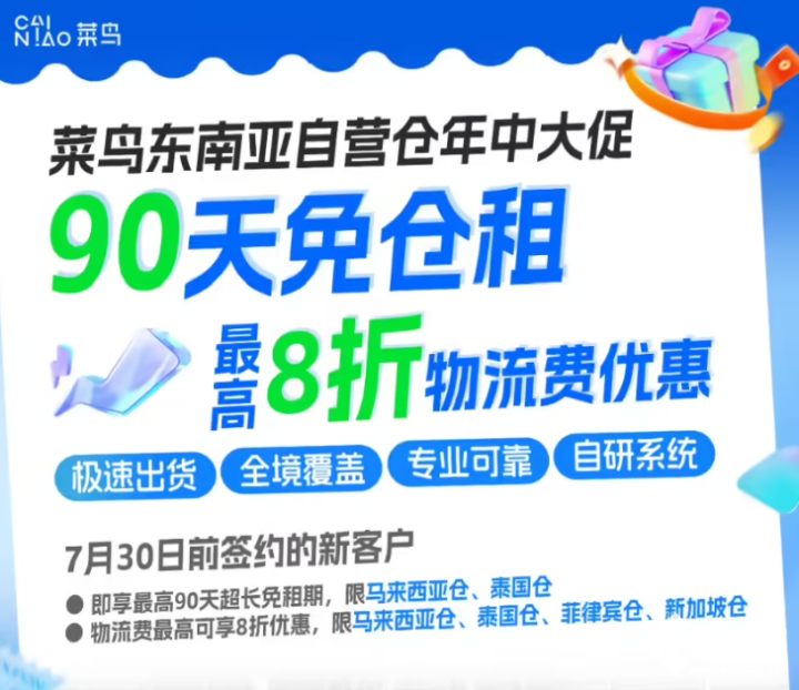 据了解,菜鸟东南亚自营仓推出了史上力度最大的扶持政策。即日起至7月30日前签约的新客户,备货入马来西亚仓、泰国仓即可享受最高90天超长免租期,大幅降低商家新品测试成本。此外,物流费最高可享8折优惠,仅限备货入马来西亚仓、泰国仓、菲律宾仓、新加坡仓,发件量越大节省越多。