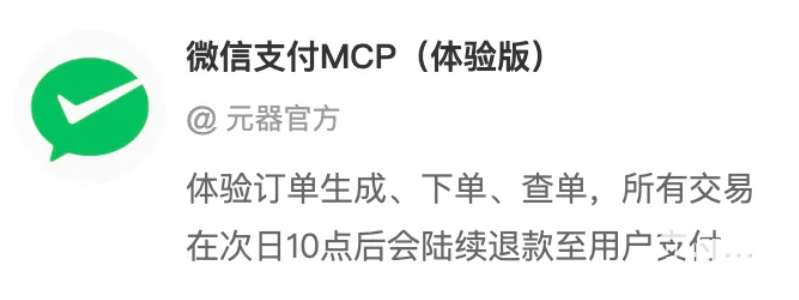 目前,元器平台已经面向开发者开放接入微信支付MCP的体验版本,正式版本在资质审核通过后开放。
