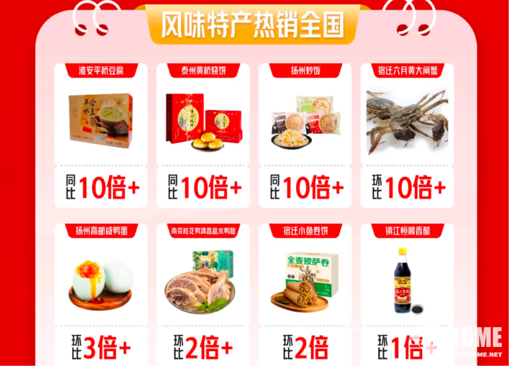 随着赛事的火爆,江苏商品的需求飞速释放。“苏超”开赛以来,江苏农特产在京东的成交额同比去年增长82%,淮安平桥豆腐、泰州黄桥烧饼、扬州炒饭等同比增长超10倍,高邮咸鸭蛋、南京桂花鸭清香盐水鸭腿、恒顺镇江香醋同样广受青睐,环比日均分别增长350%、261%、110%。