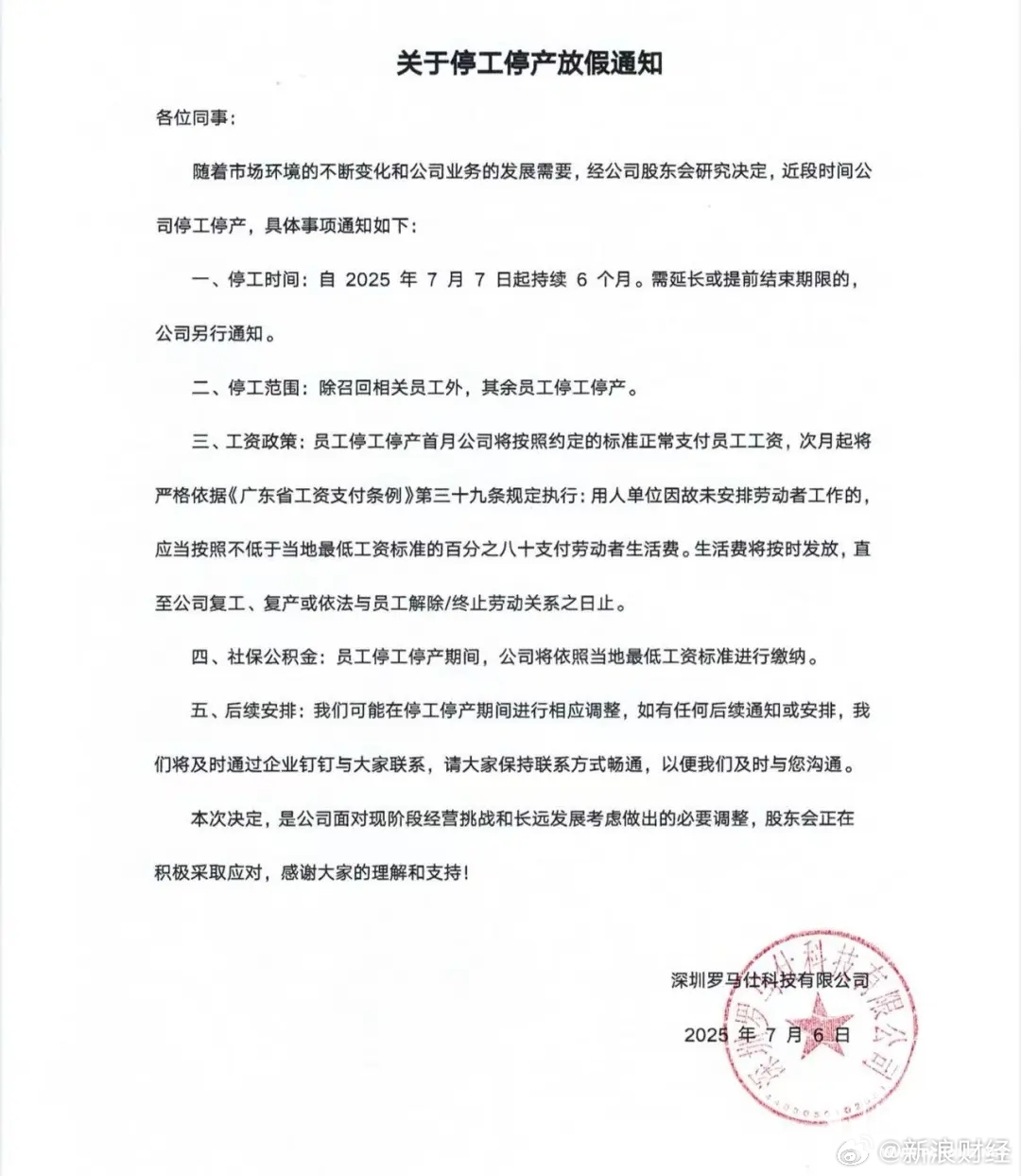 7月6日凌晨,罗马仕深夜发布通知宣布正式停工停产。通知称,“随着市场环境的不断变化和公司业务的发展需要,经公司股东会研究决定,近段时间公司停工停产。停工时间为自2025年7月7日起持续6个月。除召回相关员工外,其余员工停工停产。这期间,员工停工停产首月公司将按照约定的标准正常支付员工工资,次月起将依据当地最低工资标准的百分之八十支付劳动者生活费。公司将依照当地最低工资标准进行缴纳。”