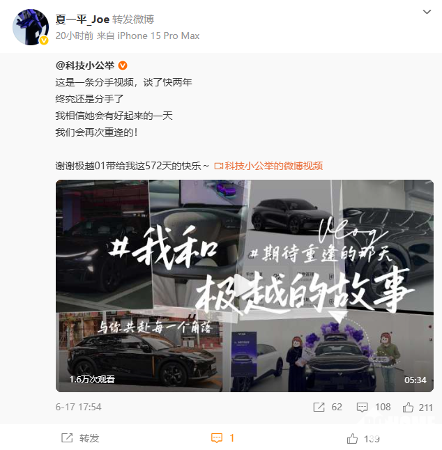 在夏一平转发的第一条视频中,该博主在视频中提到他将自己手中的极越01卖掉,并且提到最近好消息越来越多,有不少渠道传出极越正在进行资产重组,有新的投资进入。转发的第二条微博则是极越官方对于售后维保,以及智能辅助驾驶相关问题的解答。